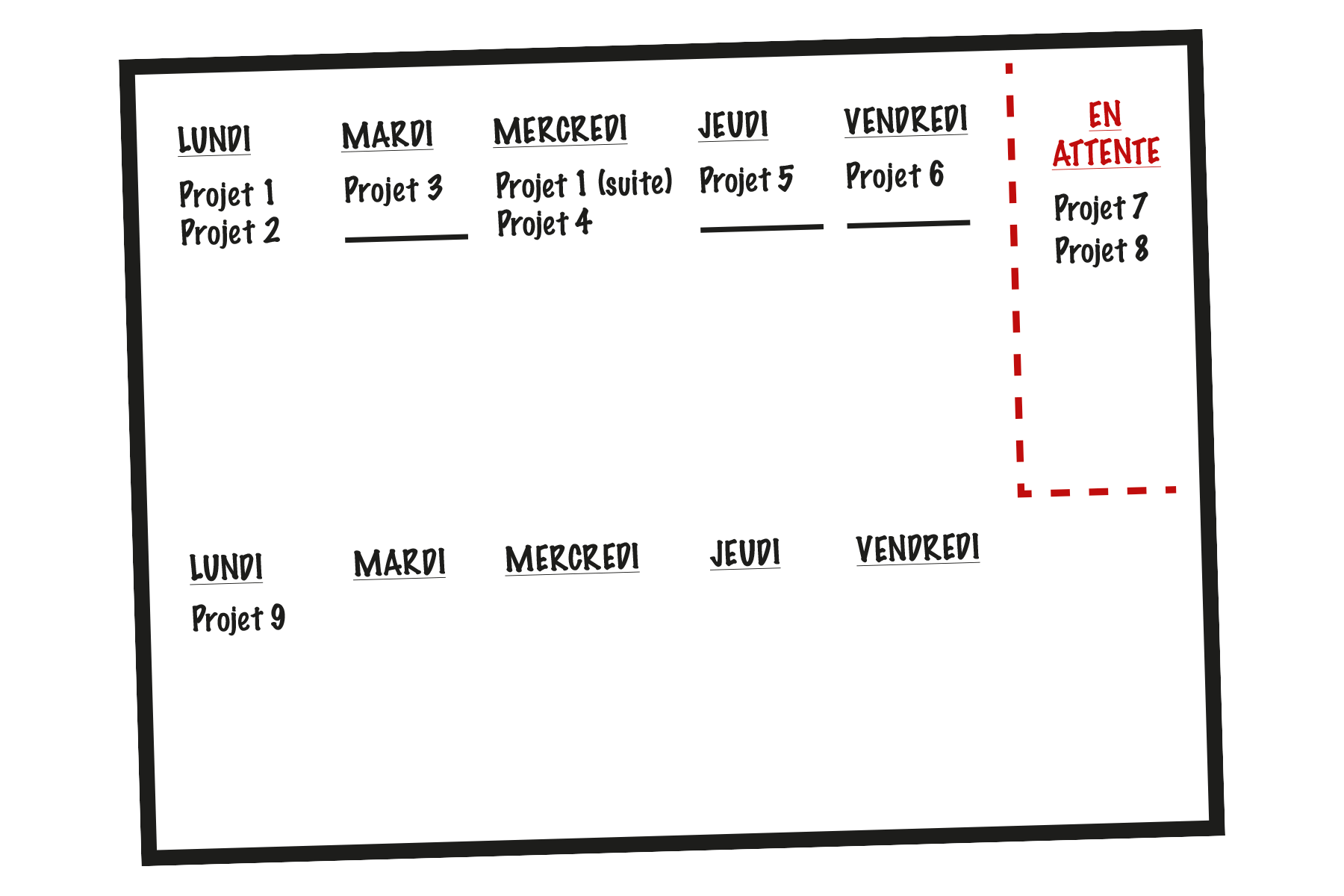 Remplissez la moitié supérieure du tableau avec cinq colonnes identifiées du LUNDI au VENDREDI et gardez un espace libre EN ATTENTE. C’est là que vous indiquerez les projets que vous ne pouvez pas encore commencer, mais qui pourraient survenir d’une journée à l’autre.